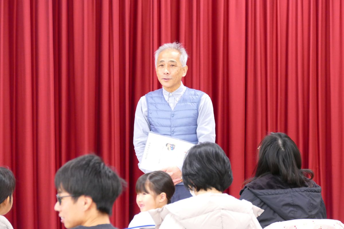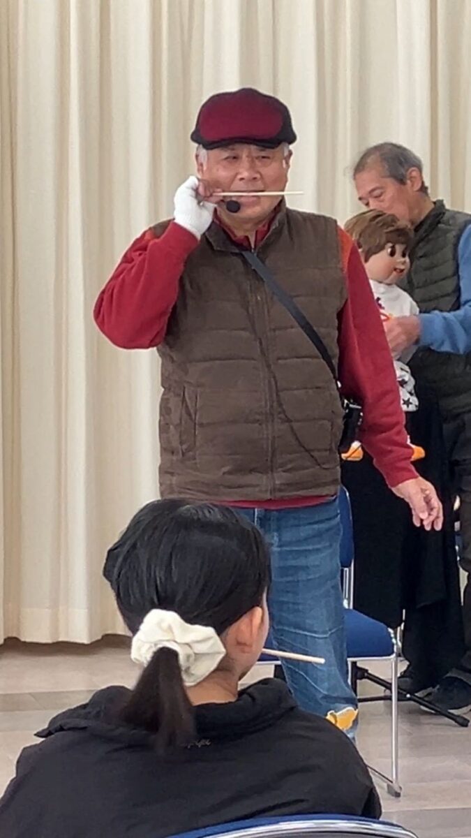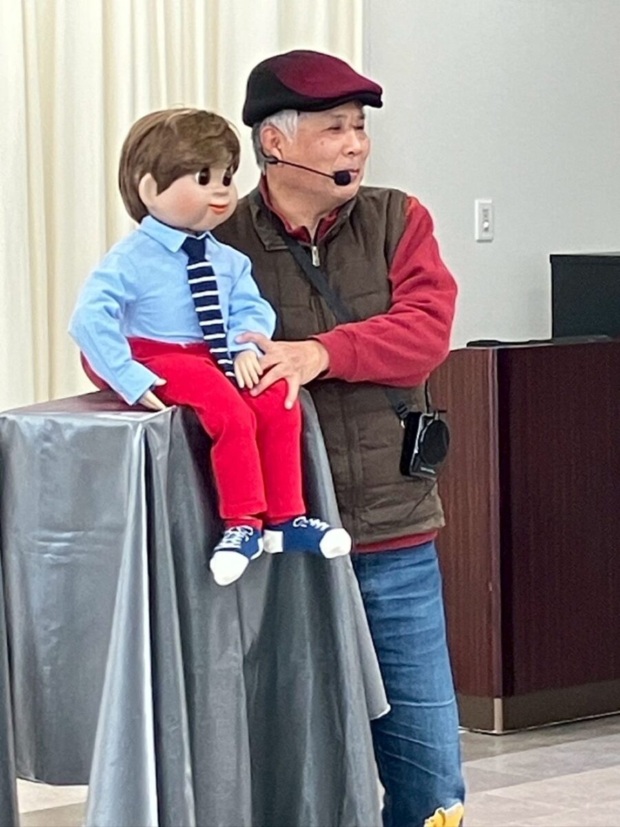 「日々笑進」の腹話術講師中川先生が子どもたちの前に登場すると、底抜けに元気な挨拶で、会場の雰囲気に明るさが増しました。まずは、「日々笑進」の皆さんのパフォーマンス。