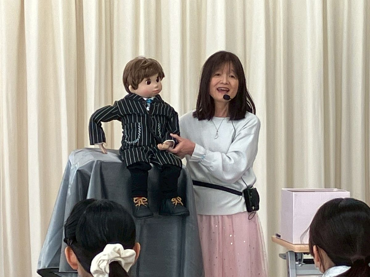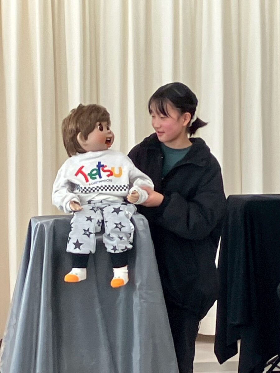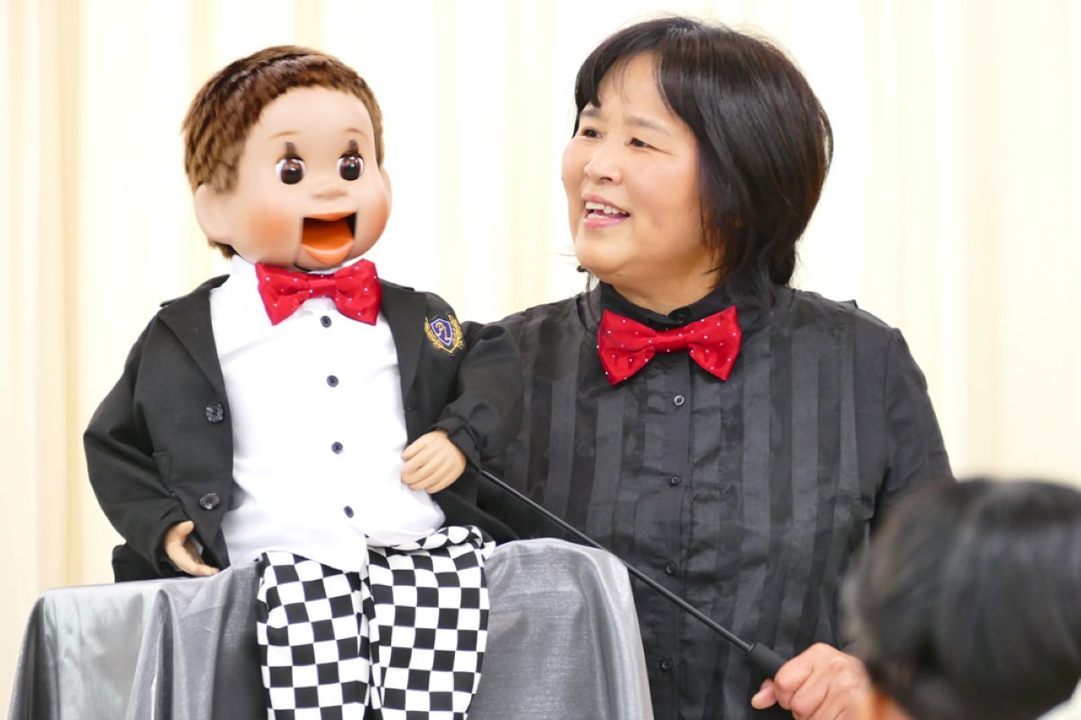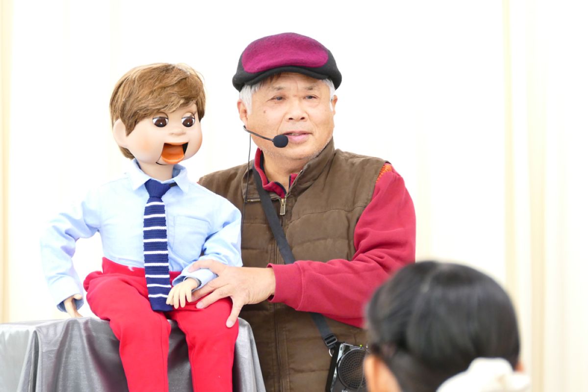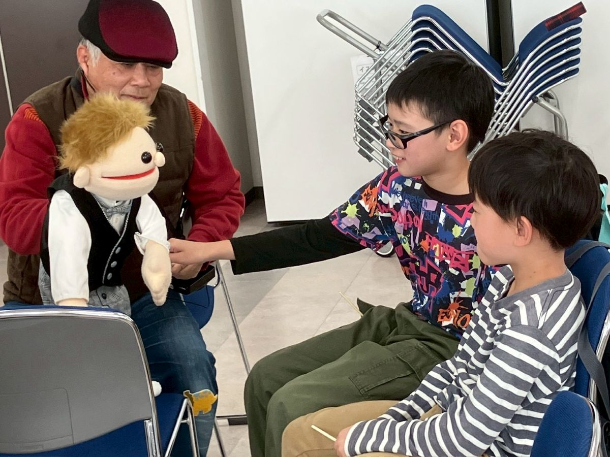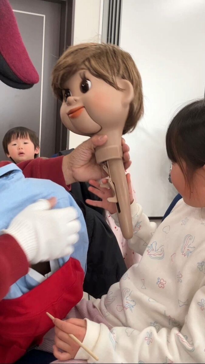 最初に、口を動かさずに発音する感覚を掴むため、割り箸を口にくわえて練習しました。みんなで犬や猫の色々な鳴きマネ(「ニャー!」「ニャッ」「ワン!」「ワンワン」等)をして唇を動かさずに発声もしました。次に、チャレンジしたい子どもたち4人が前に出て用意された椅子に座り、簡単な発声と、手の動かし方(指2本で人形のまぶた〈目〉や口を動かす)のコツを習い、実際にお人形を操作。子どもたちは緊張することなく、楽しくチャレンジしていました。人前でチャレンジした8人以外にも、リアルな顔立ちの人形だけでなくパペット人形やぬいぐるみを使い、唇を閉じたまま「こんにちわ」「僕の年齢は5歳」といった挨拶や発声をする練習が、会場のいたるところで活発に繰り広げられました。