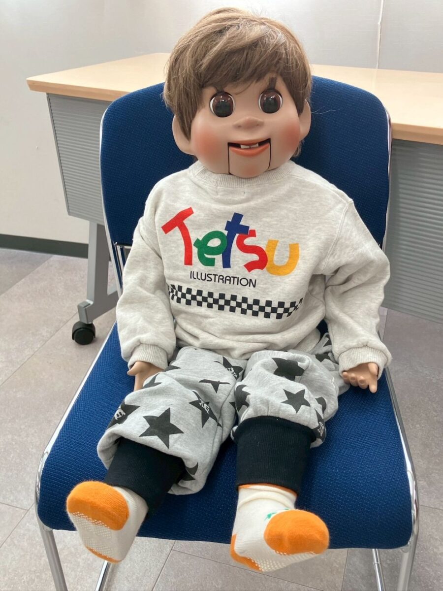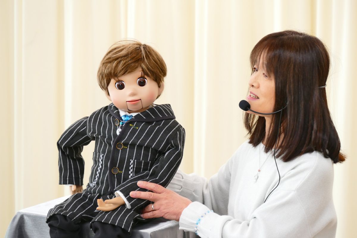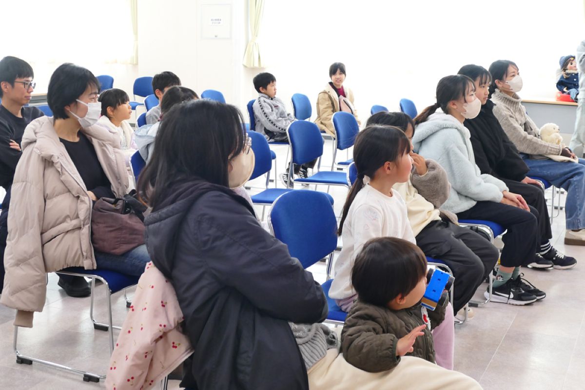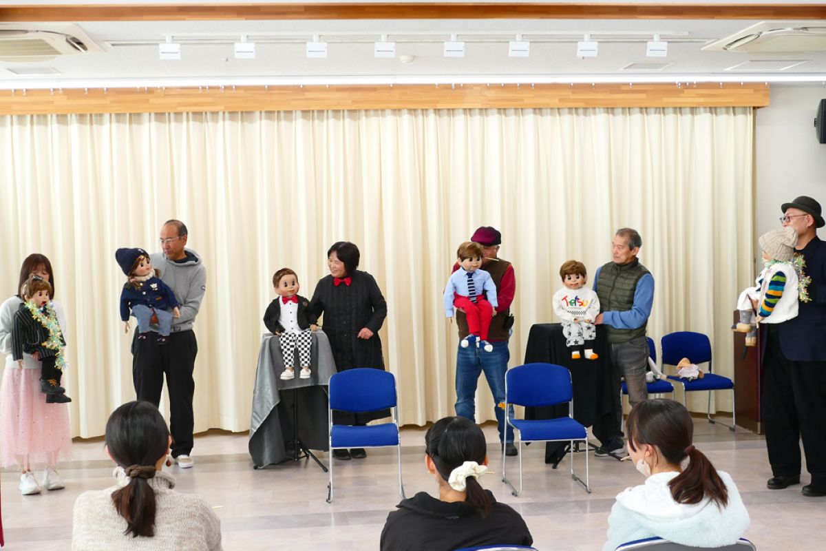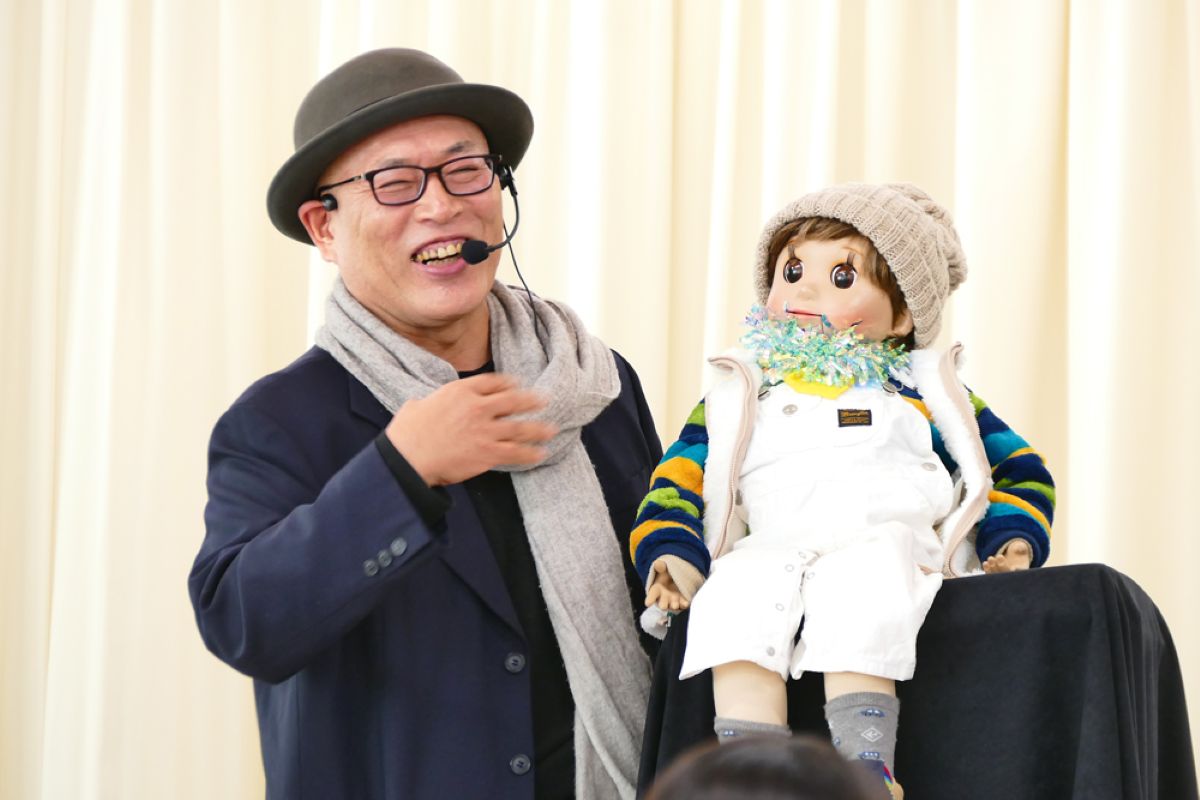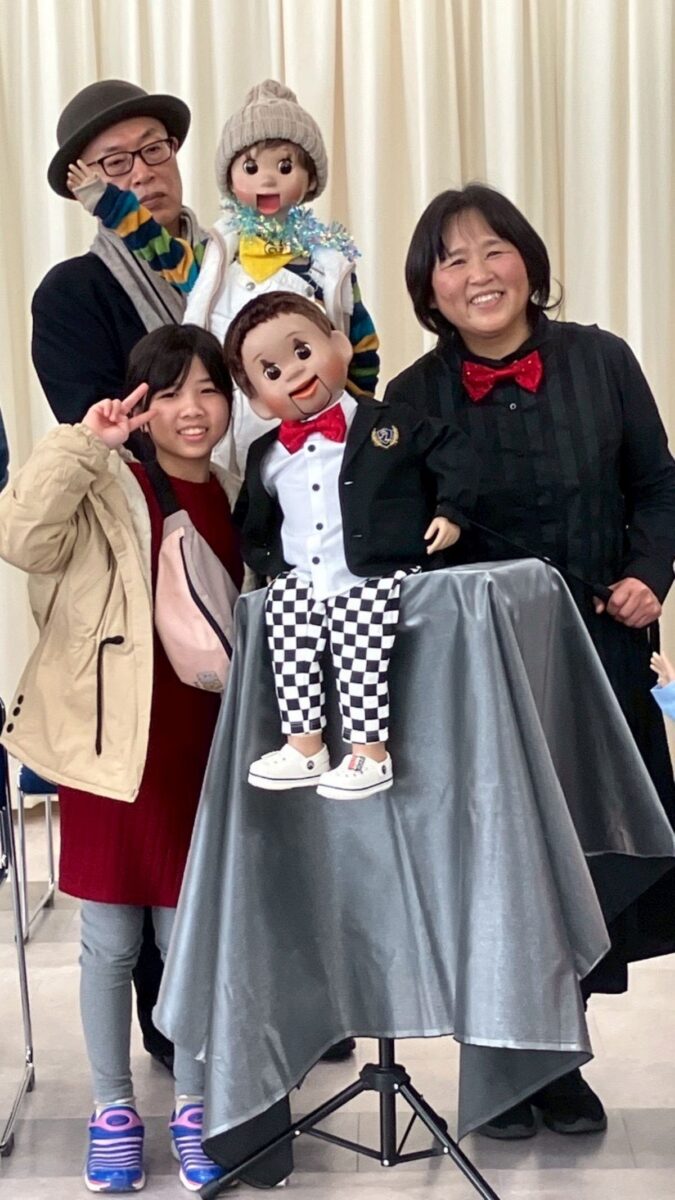 最初に、口を動かさずに発音する感覚を掴むため、割り箸を口にくわえて練習しました。みんなで犬や猫の色々な鳴きマネ(「ニャー!」「ニャッ」「ワン!」「ワンワン」等)をして唇を動かさずに発声もしました。次に、チャレンジしたい子どもたち4人が前に出て用意された椅子に座り、簡単な発声と、手の動かし方(指2本で人形のまぶた〈目〉や口を動かす)のコツを習い、実際にお人形を操作。子どもたちは緊張することなく、楽しくチャレンジしていました。人前でチャレンジした8人以外にも、リアルな顔立ちの人形だけでなくパペット人形やぬいぐるみを使い、唇を閉じたまま「こんにちわ」「僕の年齢は5歳」といった挨拶や発声をする練習が、会場のいたるところで活発に繰り広げられました。