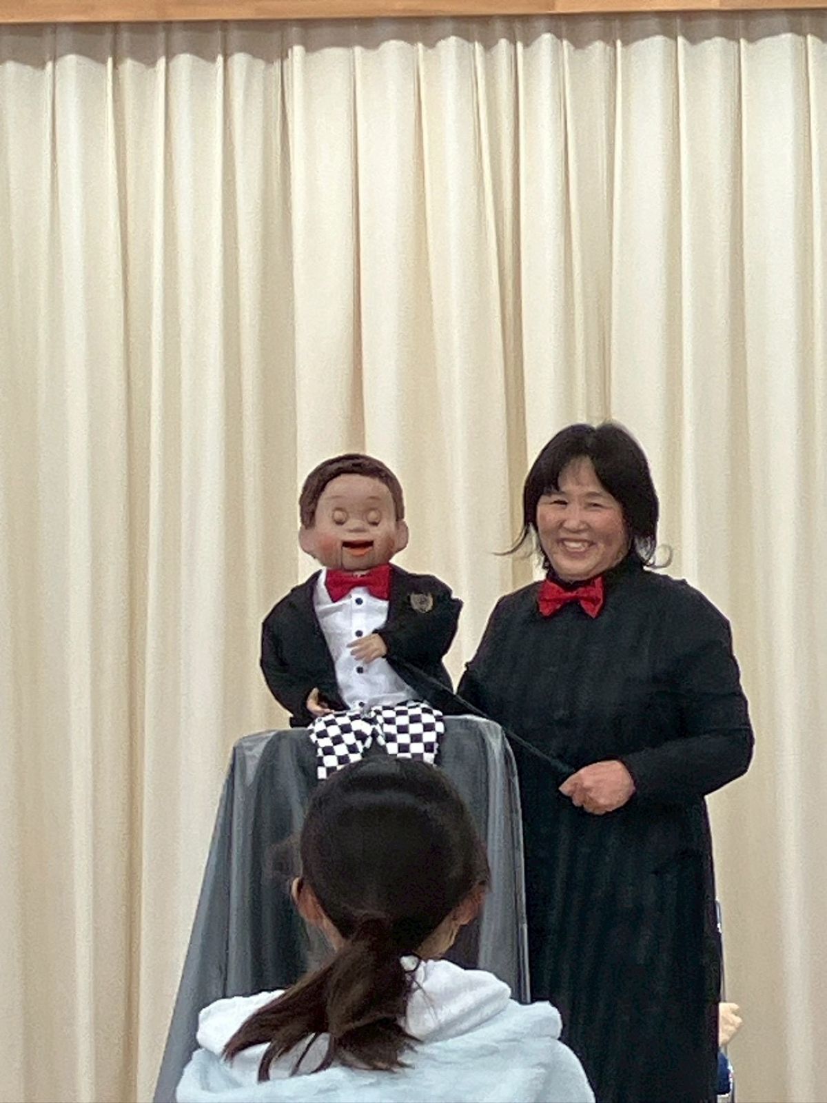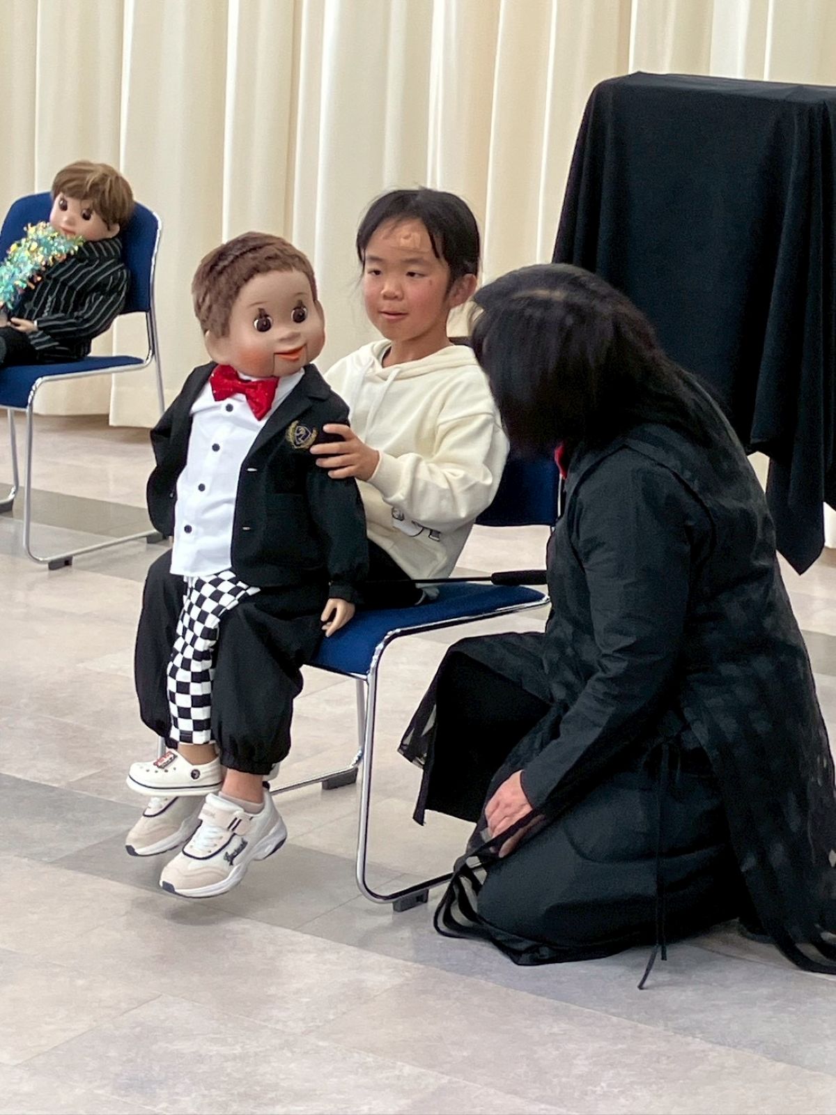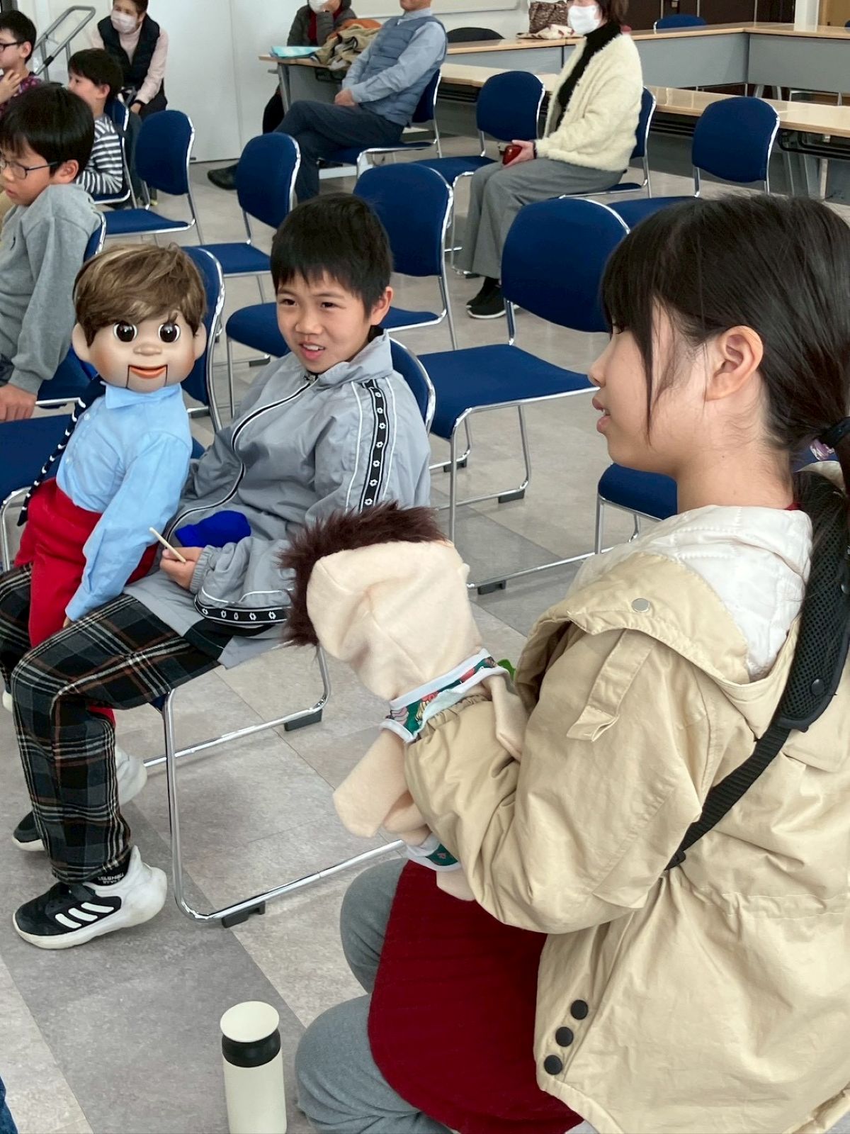 最初に、口を動かさずに発音する感覚を掴むため、割り箸を口にくわえて練習しました。みんなで犬や猫の色々な鳴きマネ(「ニャー!」「ニャッ」「ワン!」「ワンワン」等)をして唇を動かさずに発声もしました。次に、チャレンジしたい子どもたち4人が前に出て用意された椅子に座り、簡単な発声と、手の動かし方(指2本で人形のまぶた〈目〉や口を動かす)のコツを習い、実際にお人形を操作。子どもたちは緊張することなく、楽しくチャレンジしていました。人前でチャレンジした8人以外にも、リアルな顔立ちの人形だけでなくパペット人形やぬいぐるみを使い、唇を閉じたまま「こんにちわ」「僕の年齢は5歳」といった挨拶や発声をする練習が、会場のいたるところで活発に繰り広げられました。
