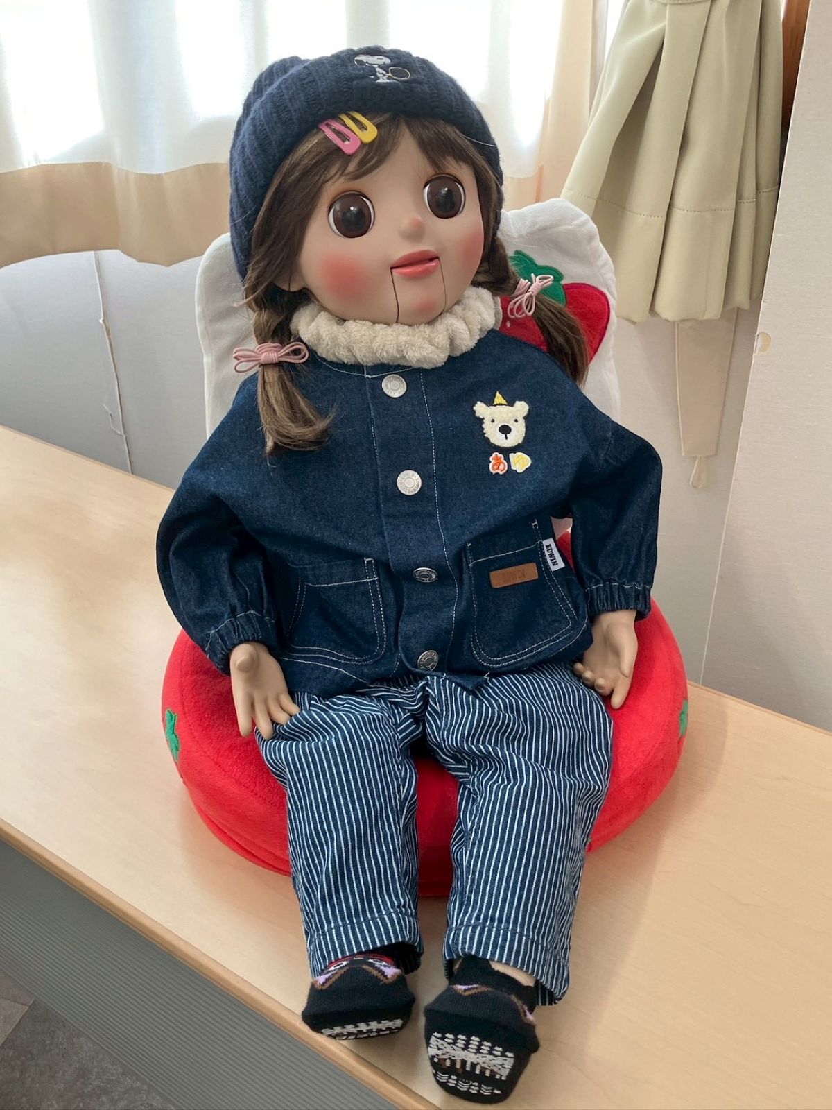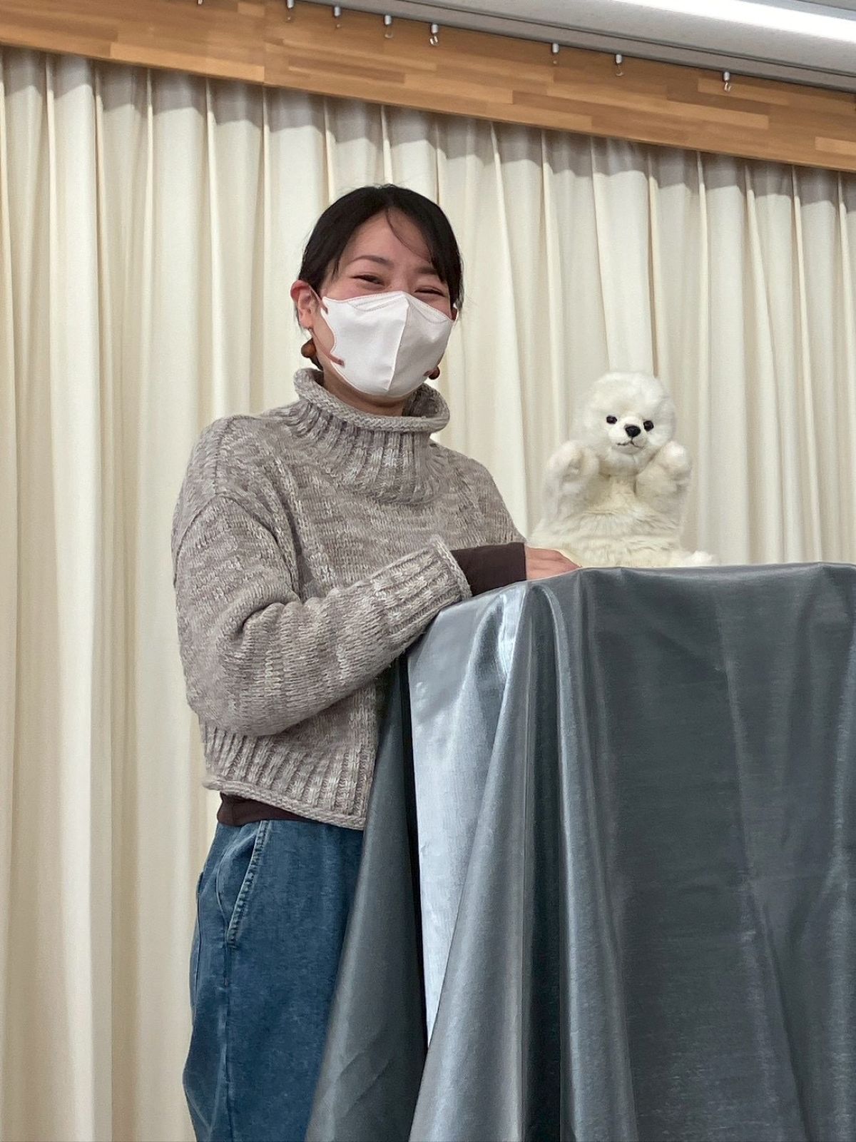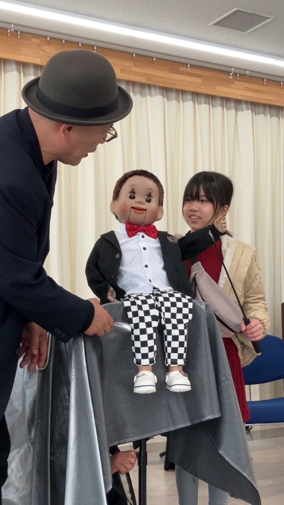 最初に、口を動かさずに発音する感覚を掴むため、割り箸を口にくわえて練習しました。みんなで犬や猫の色々な鳴きマネ(「ニャー!」「ニャッ」「ワン!」「ワンワン」等)をして唇を動かさずに発声もしました。次に、チャレンジしたい子どもたち4人が前に出て用意された椅子に座り、簡単な発声と、手の動かし方(指2本で人形のまぶた〈目〉や口を動かす)のコツを習い、実際にお人形を操作。子どもたちは緊張することなく、楽しくチャレンジしていました。人前でチャレンジした8人以外にも、リアルな顔立ちの人形だけでなくパペット人形やぬいぐるみを使い、唇を閉じたまま「こんにちわ」「僕の年齢は5歳」といった挨拶や発声をする練習が、会場のいたるところで活発に繰り広げられました。