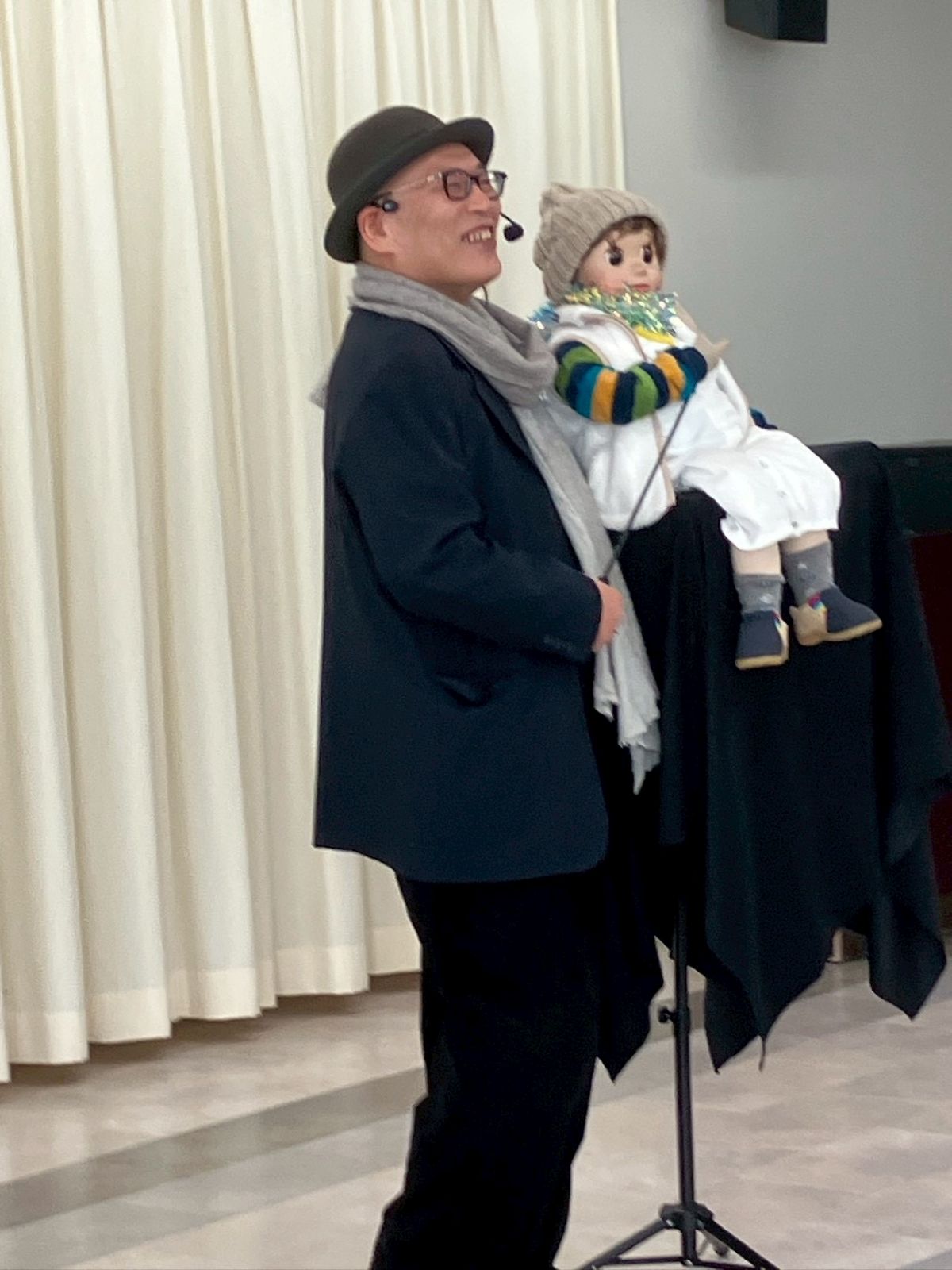「日々笑進」の腹話術講師中川先生が子どもたちの前に登場すると、底抜けに元気な挨拶で、会場の雰囲気に明るさが増しました。まずは、「日々笑進」の皆さんのパフォーマンス。