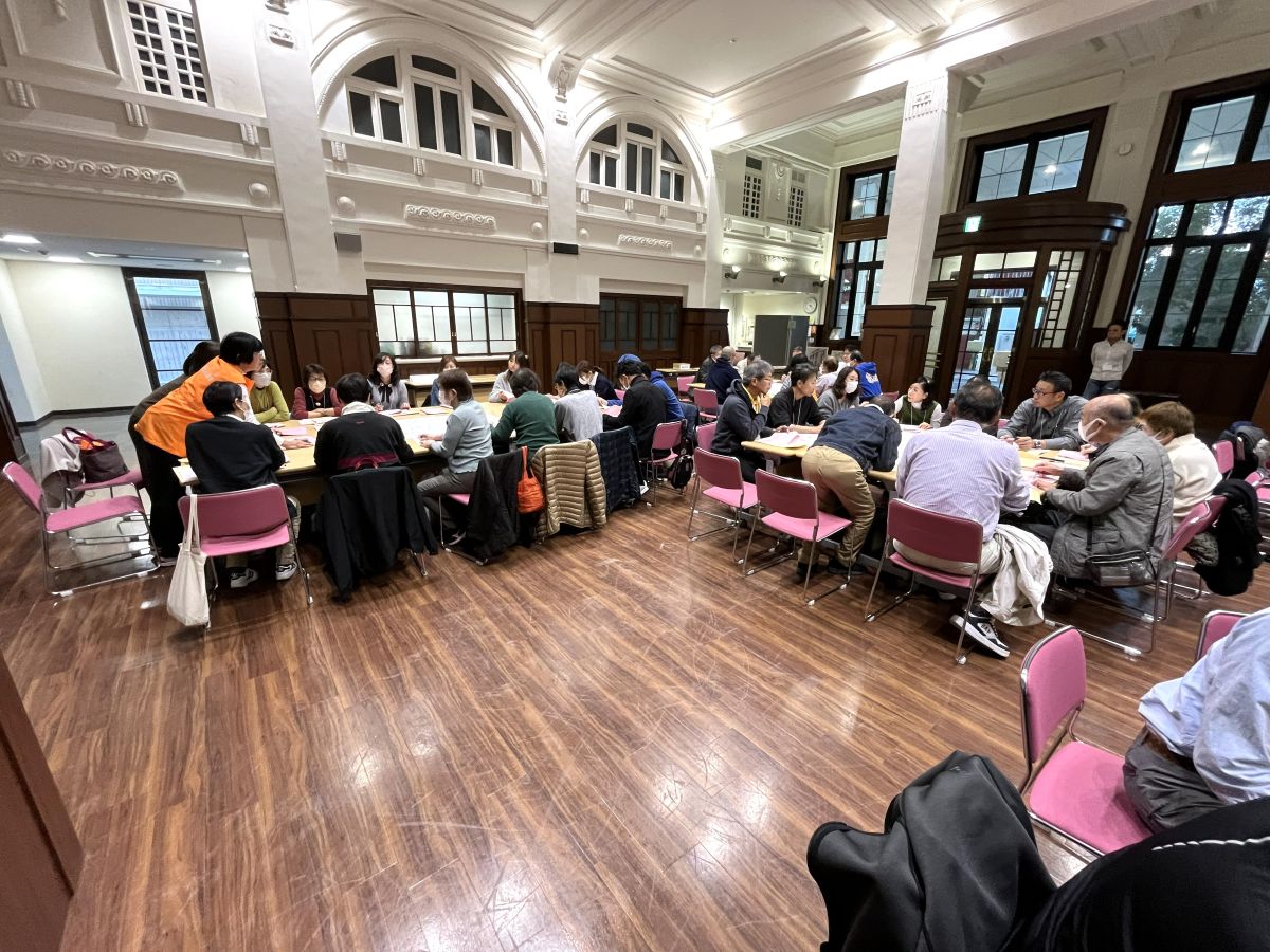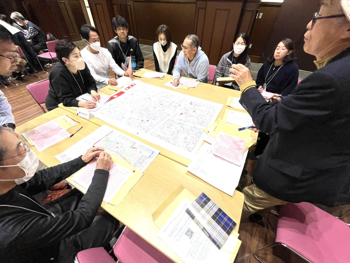 大志連区在住で役職、老若男女問わず幅広い一般の方約80名が参加されました。災害時に助けが必要な方を大志連区を4つのエリアクに分けて、その近隣在住の方々でグループを作り、地図上で対象者を示し、どういう人か、一人暮らしかなどの情報共有を行い、対象者以外にも支援が必要な人がいないか意見を出し合いました。