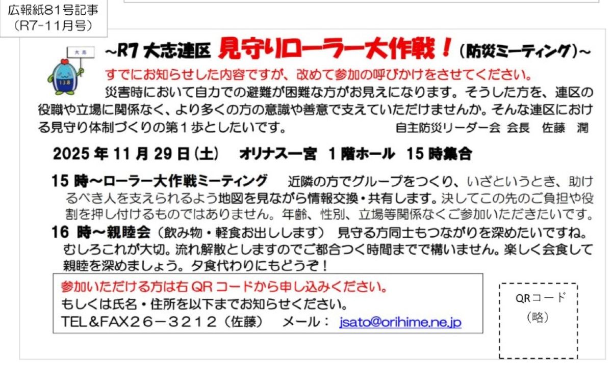 11月29日(土)午後3時よりオリナス一宮で開催されました「R7大志連区見守りローラー大作戦!(防災ミーティング)」を大志連区地域づくり協議会木村会長のご厚意により見学させていただきました。
