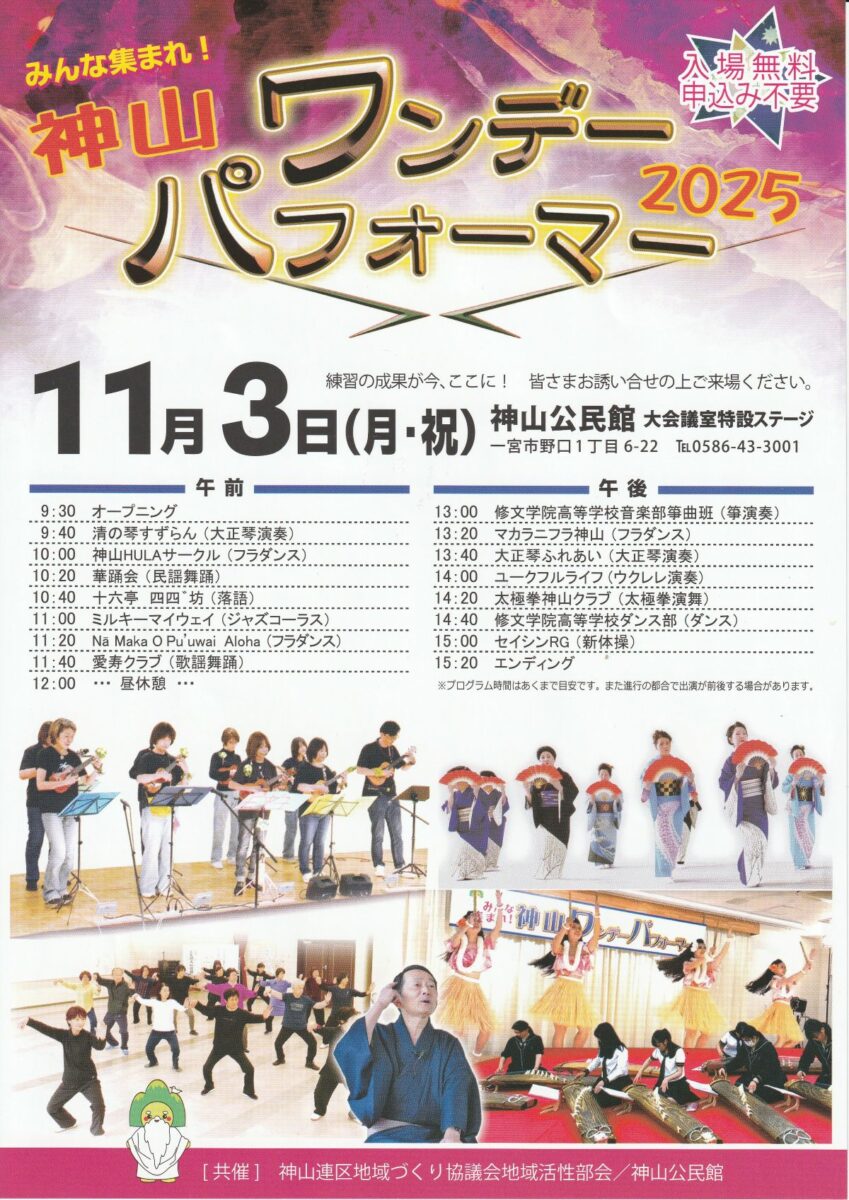 11月3日(月・祝)神山公民館大会議室で、今年で10回目の「みんな集まれ! 神山ワンデーパフォーマー2025」が開催されました。