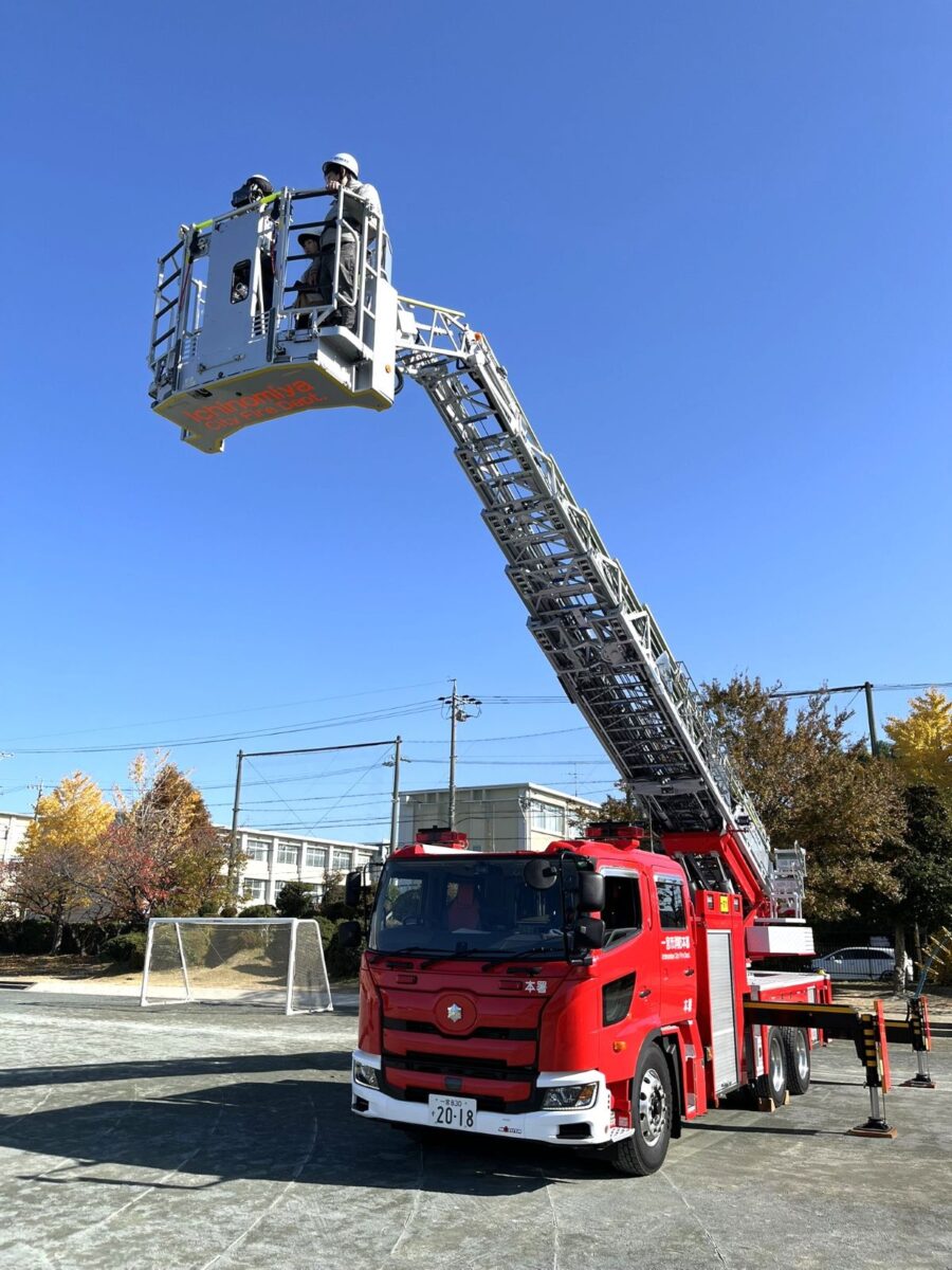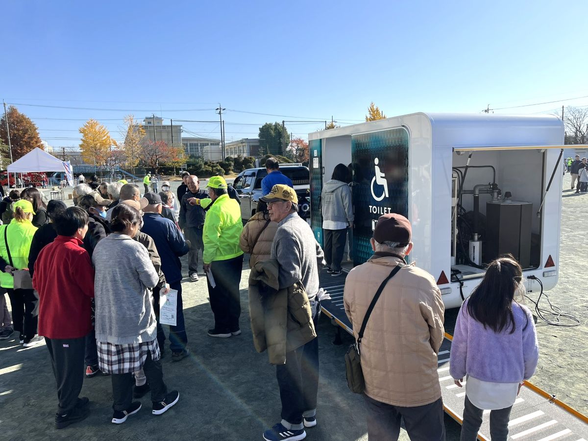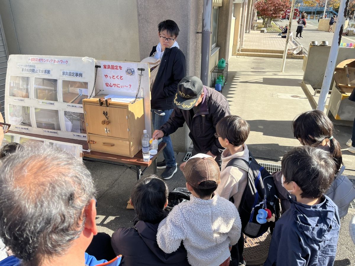 防災訓練は町内回覧で告知し、事前申し込みはなし、当日来場された方を4つのグループに分け、20分ずつ①消火訓練、②AED訓練、③防災倉庫の見学(家具固定、凝固剤の説明、移動式トイレ車の展示含む)、④炊き出し見学を行いました。小学生の希望者ははしご車乗車体験も行いました。