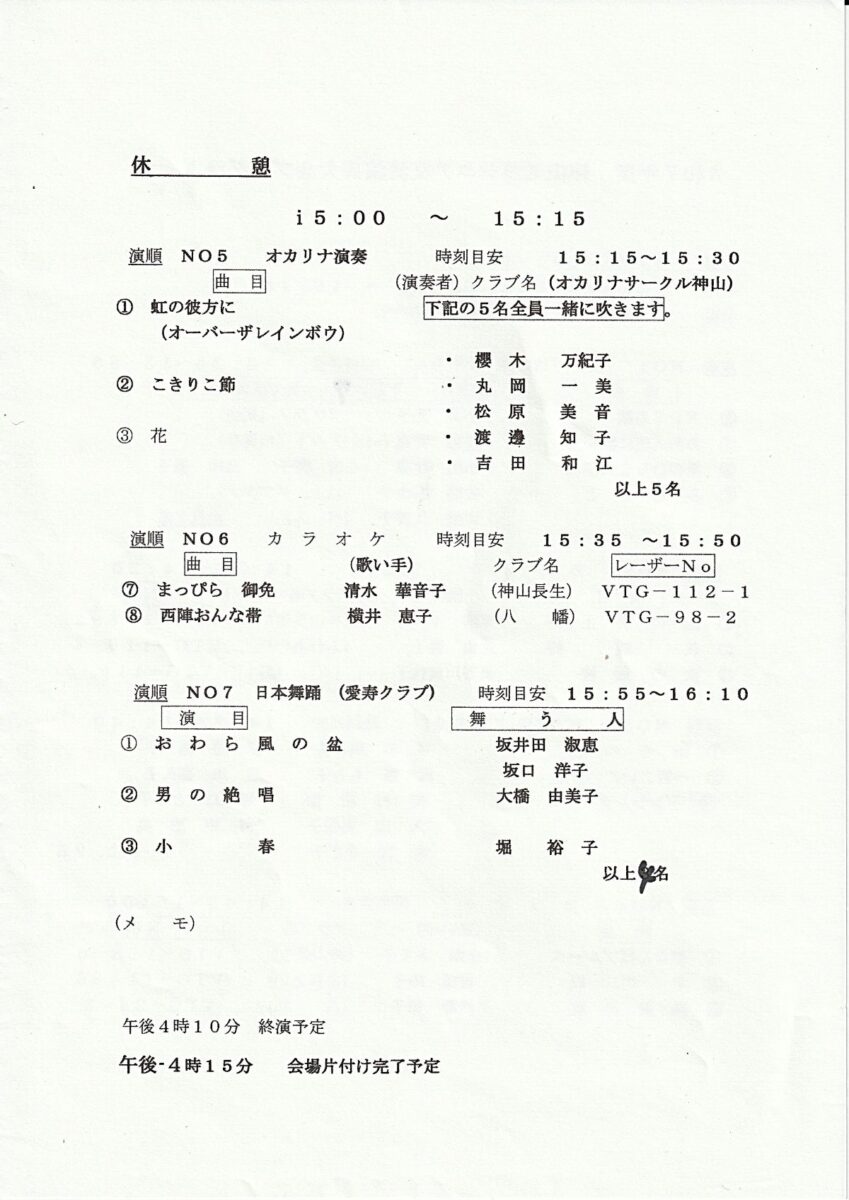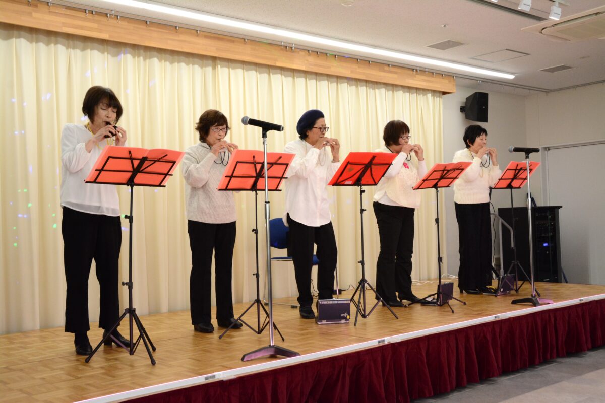 カラオケ、大正琴演奏、舞部、オカリナ演奏と多数のグループ発表がありました。最新演歌、古典舞部ほかバリエーション豊富な演目で、鑑賞に来られた方々を楽しませていただきました。