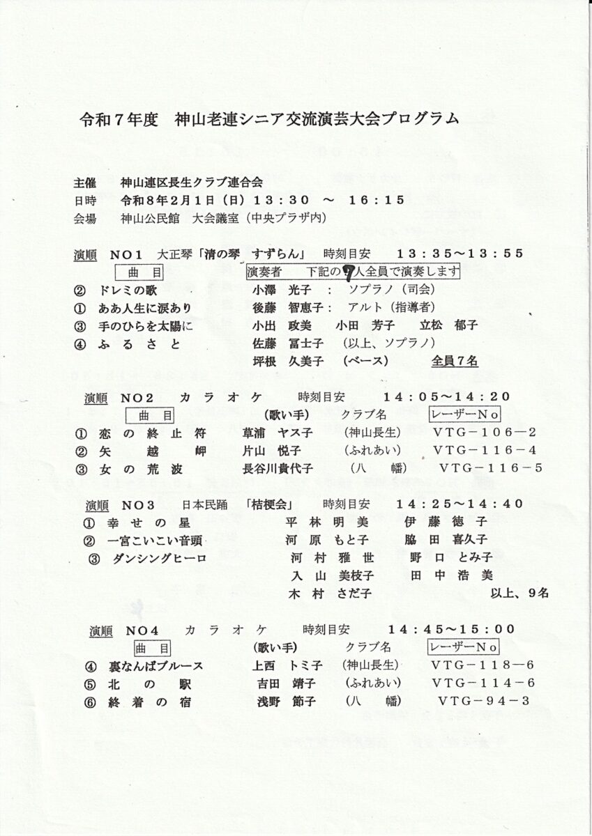 2月1日(日)午後1時30分より神山公民館大会議室で、令和7年度 神山老連シニア交流演芸大会を行いました。