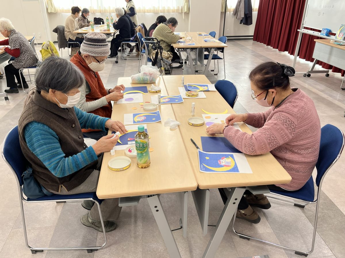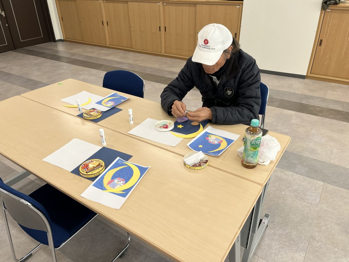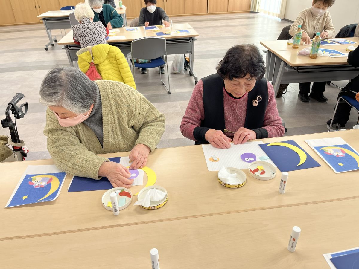 第10回は平野先生の「作品づくりと脳トレ」、前半はふくろうのはり絵で、用意された月や親子ふくろうのパーツを見本を見ながらのりで台紙に貼り付け完成。