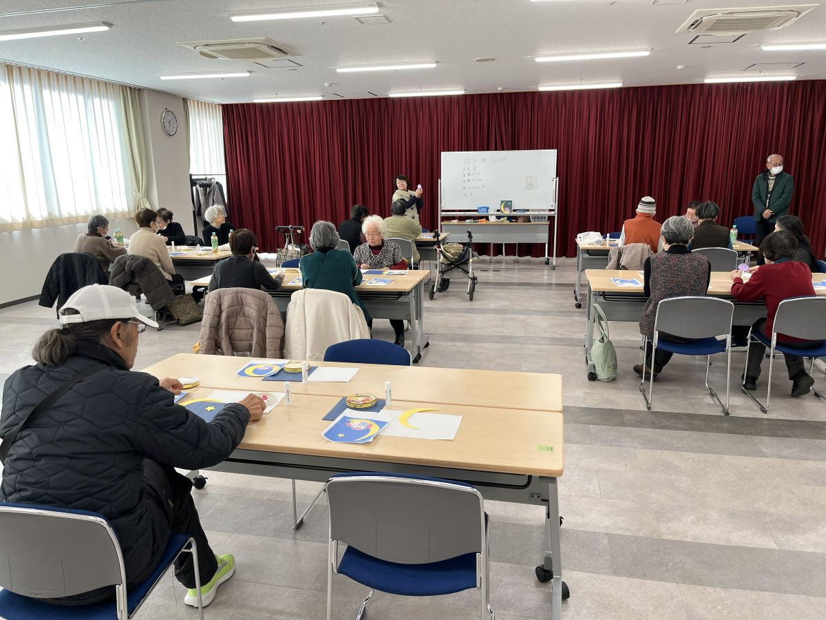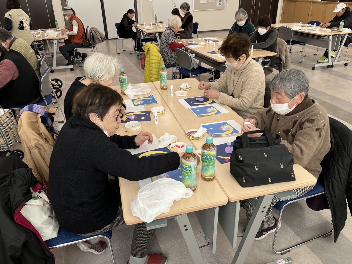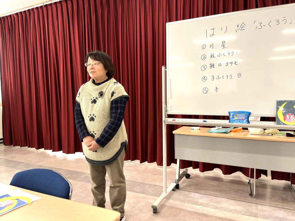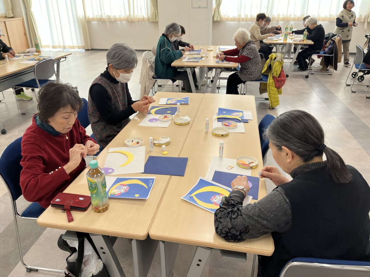 第10回は平野先生の「作品づくりと脳トレ」、前半はふくろうのはり絵で、用意された月や親子ふくろうのパーツを見本を見ながらのりで台紙に貼り付け完成。