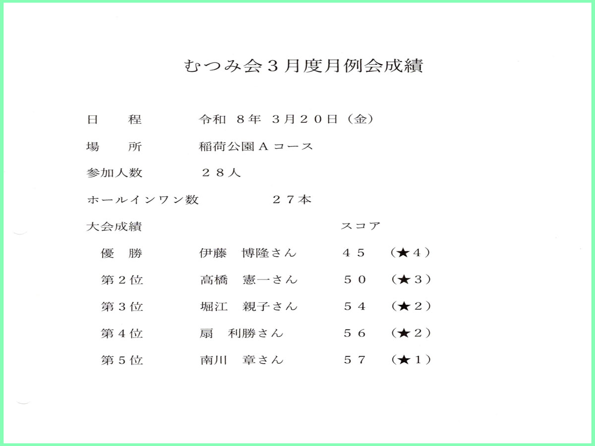 月例会となると俄然頑張りが出まして、ホールインワンが大量に出ました。28名の参加でホールインワン27個です。優勝者はホールインワン4個、スコア45 アッパレです!!