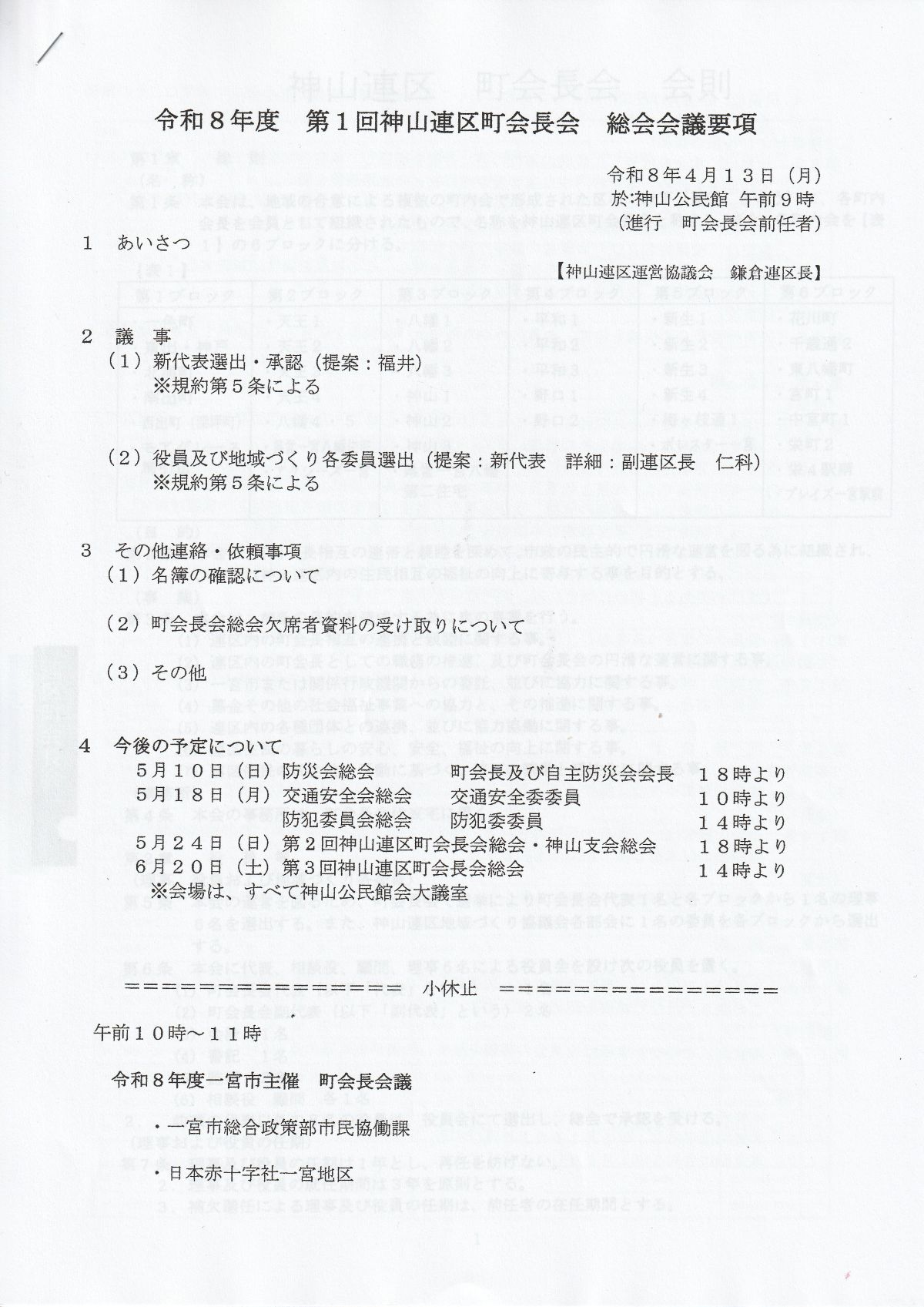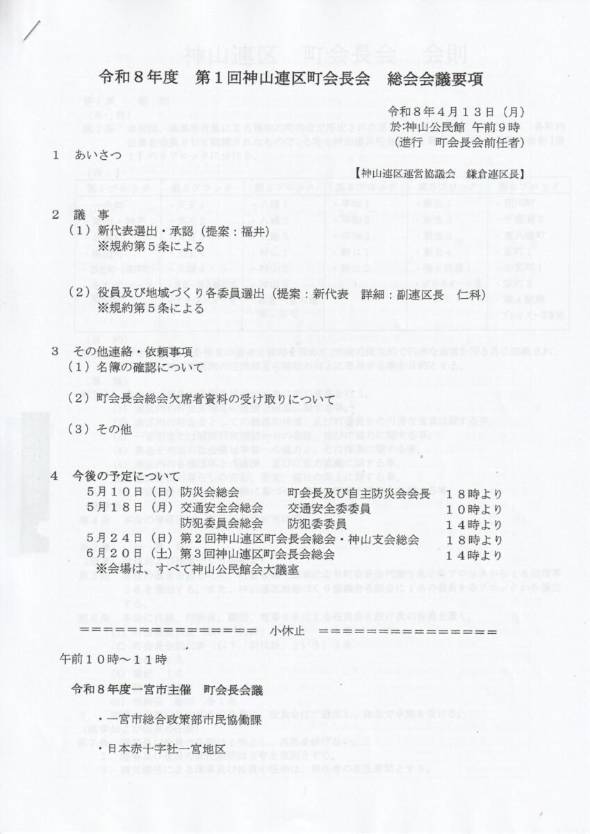 4月13日(月)午前9時より神山公民館大会議室で、新町会長が参加して令和8年度 第1回神山連区町会長会 総会を行いました。